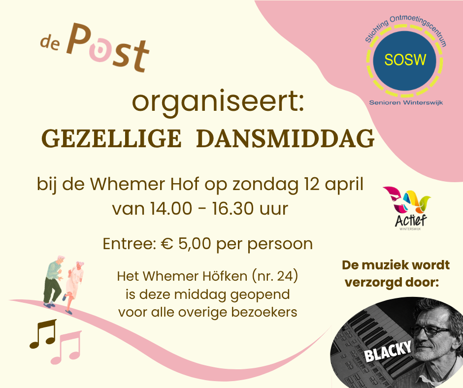 “De Post” nodigt je van harte uit voor een gezellige dansmiddag vol muziek, beweging en fijne ontmoetingen. Op zondag 12 april, van 14.00 tot 16.30 uur, staat alles in het teken van samen genieten. Want laten we eerlijk zijn: bewegen is gezond — en als het ook nog gezellig is, vliegt de tijd voorbij!